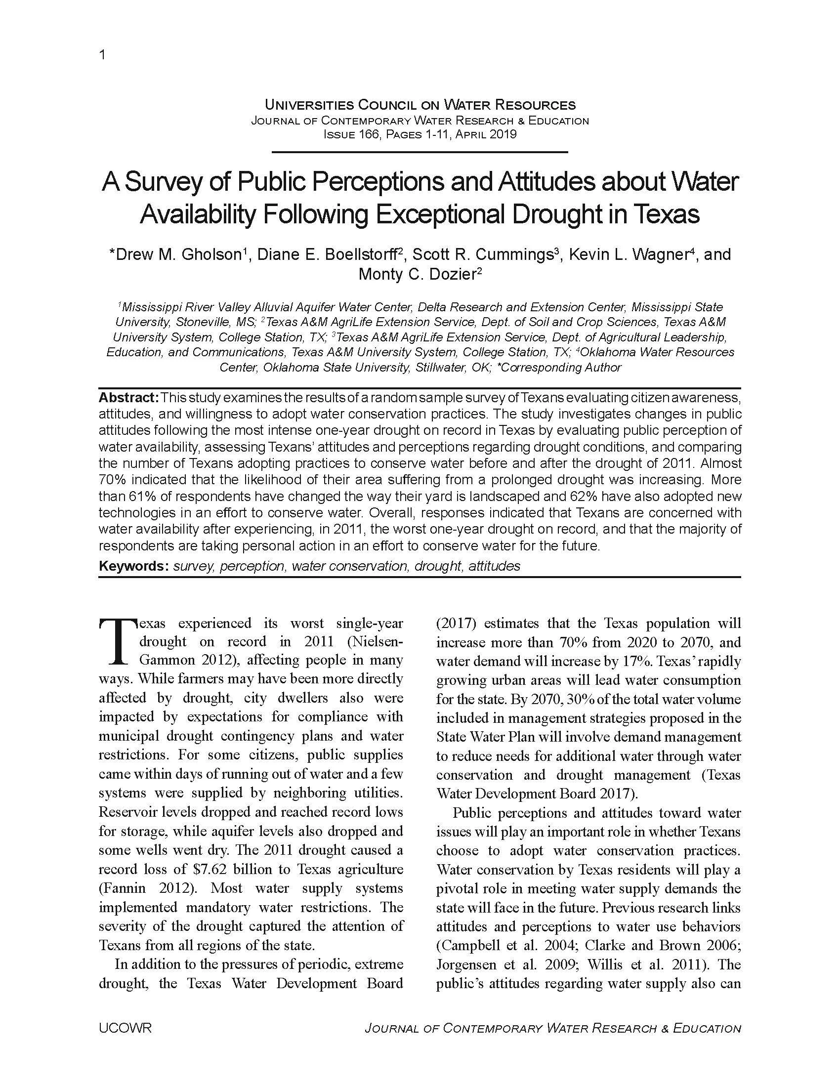 A Survey of Public Perceptions and Attitudes about Water Availability Following Exceptional Drought in Texas Download PDF Back to Resource Library WATER DATAGuest UserApril 1, 2019Journal of Contemporary Water Research & Education, Universities Council on Water Resources, Drought, Policy, Drew Gholson, Diane Boellstorff, Scott Cummings, Kevin Wagner, Monty Dozier Facebook0 Twitter Pinterest0 0 Likes