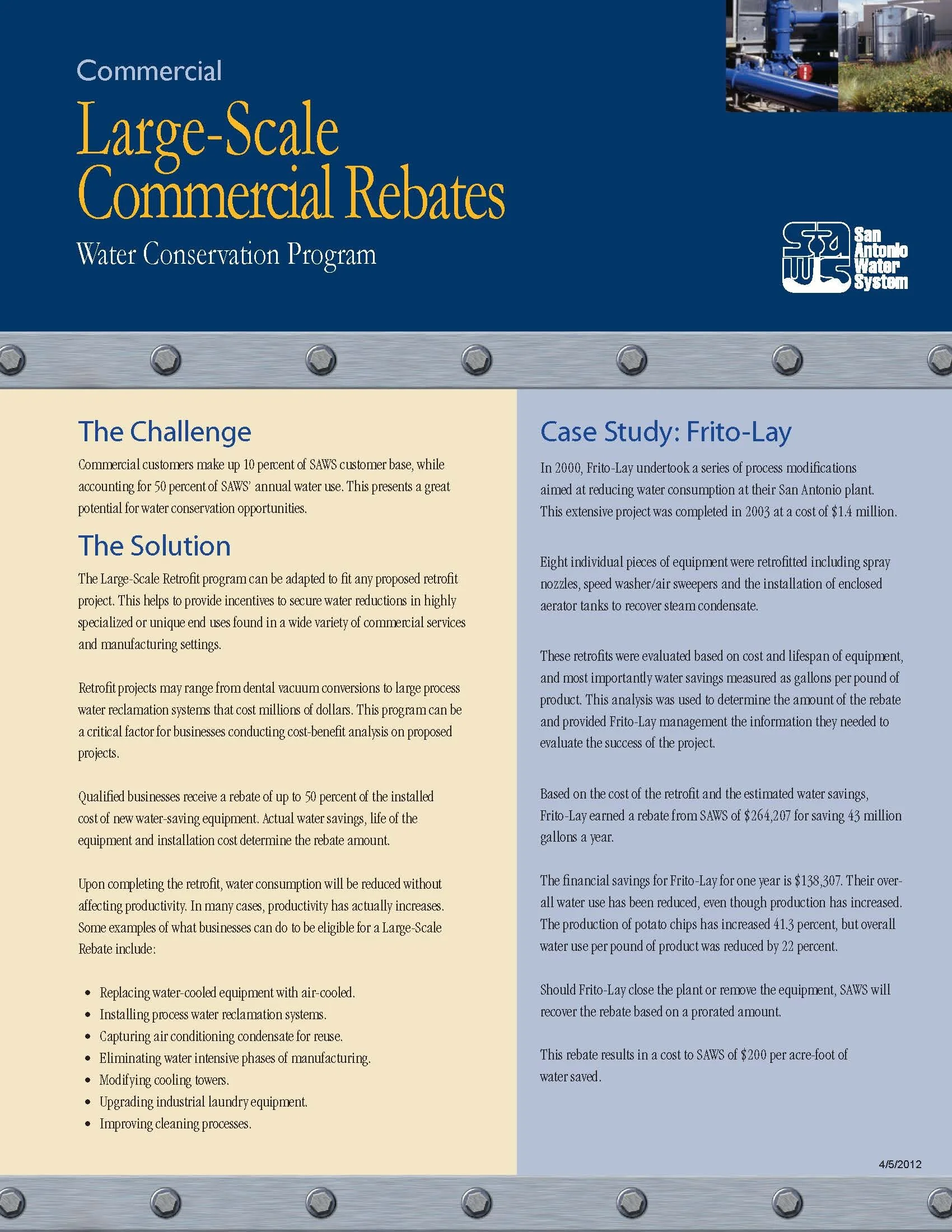 Large-Scale Commercial Rebates - Water Conservation Program Download PDF Back to Resource Library WATER CONSERVATIONGuest UserApril 5, 2012San Antonio Water System, SAWS, Commercial Facebook0 Twitter Pinterest0 0 Likes