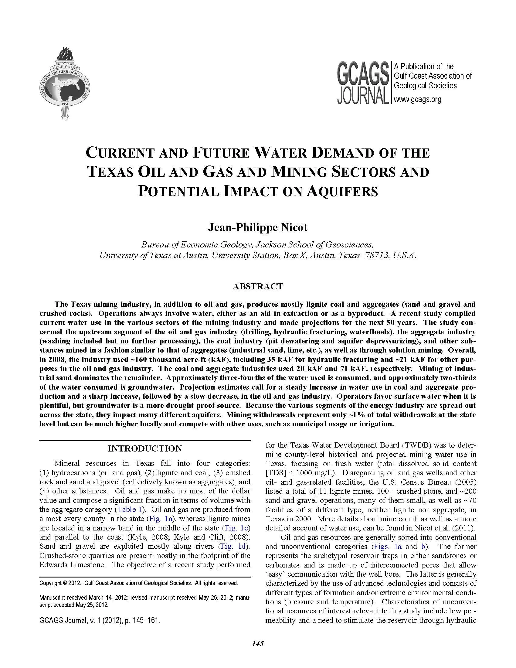 Current and Future Water Demand of the Texxas Oil and Gas and Mining Sectors and Potential Impact on Aquifers Download PDF Back to Resource Library WATER/ENERGY NEXUSGuest UserMay 25, 2012GCAGS Journal, Gulf Coast Association of Geological Societies, University of Texas at Austin Facebook0 Twitter Pinterest0 0 Likes