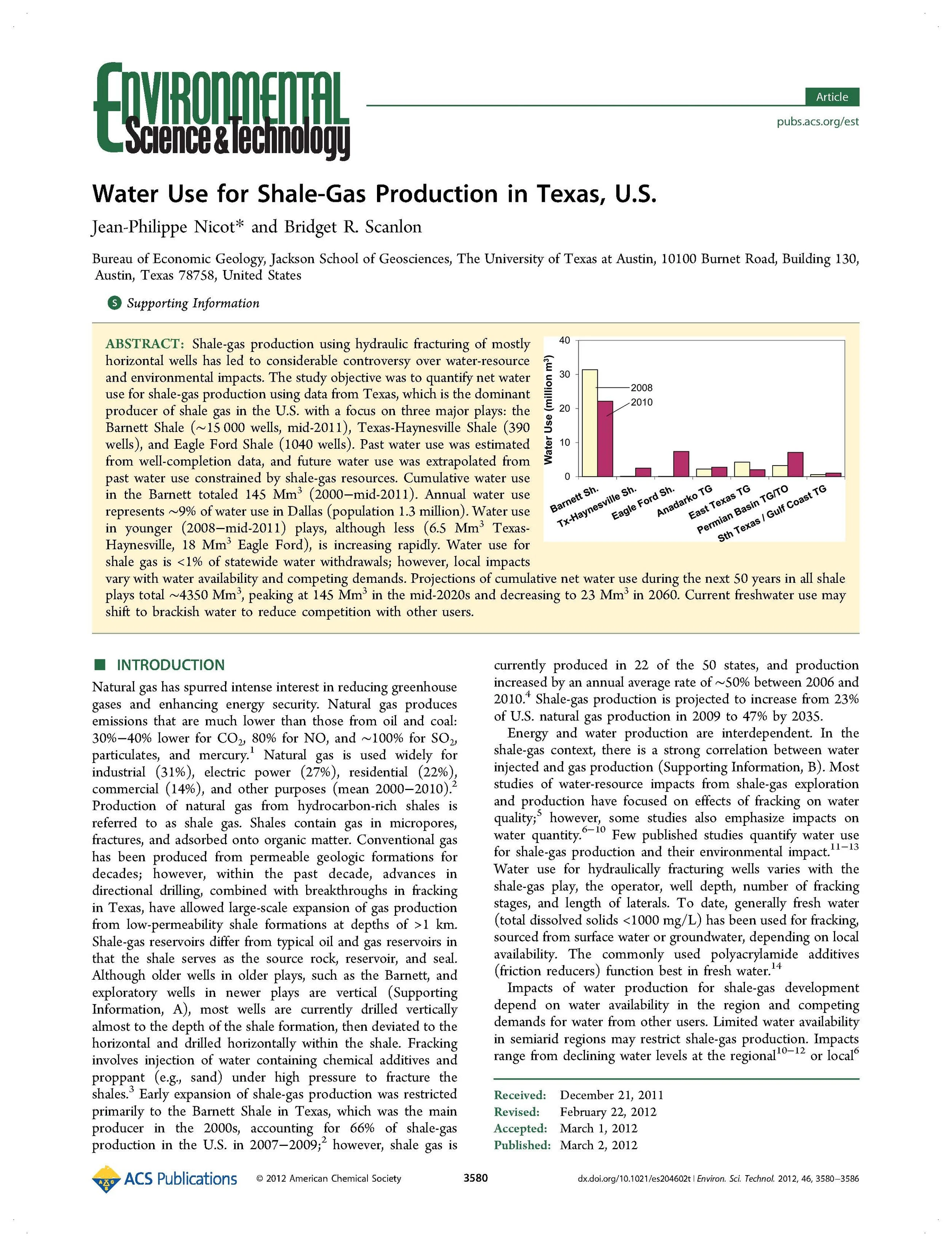 Water Use for Shale-Gas Production in Texas, U.S. Download PDF Back to Resource Library WATER/ENERGY NEXUSGuest UserMarch 2, 2012Environmental Science & Technology, ACS Publications, Energy, Jean-Philippe Nicot, Bridget Scanlon Facebook0 Twitter Pinterest0 0 Likes