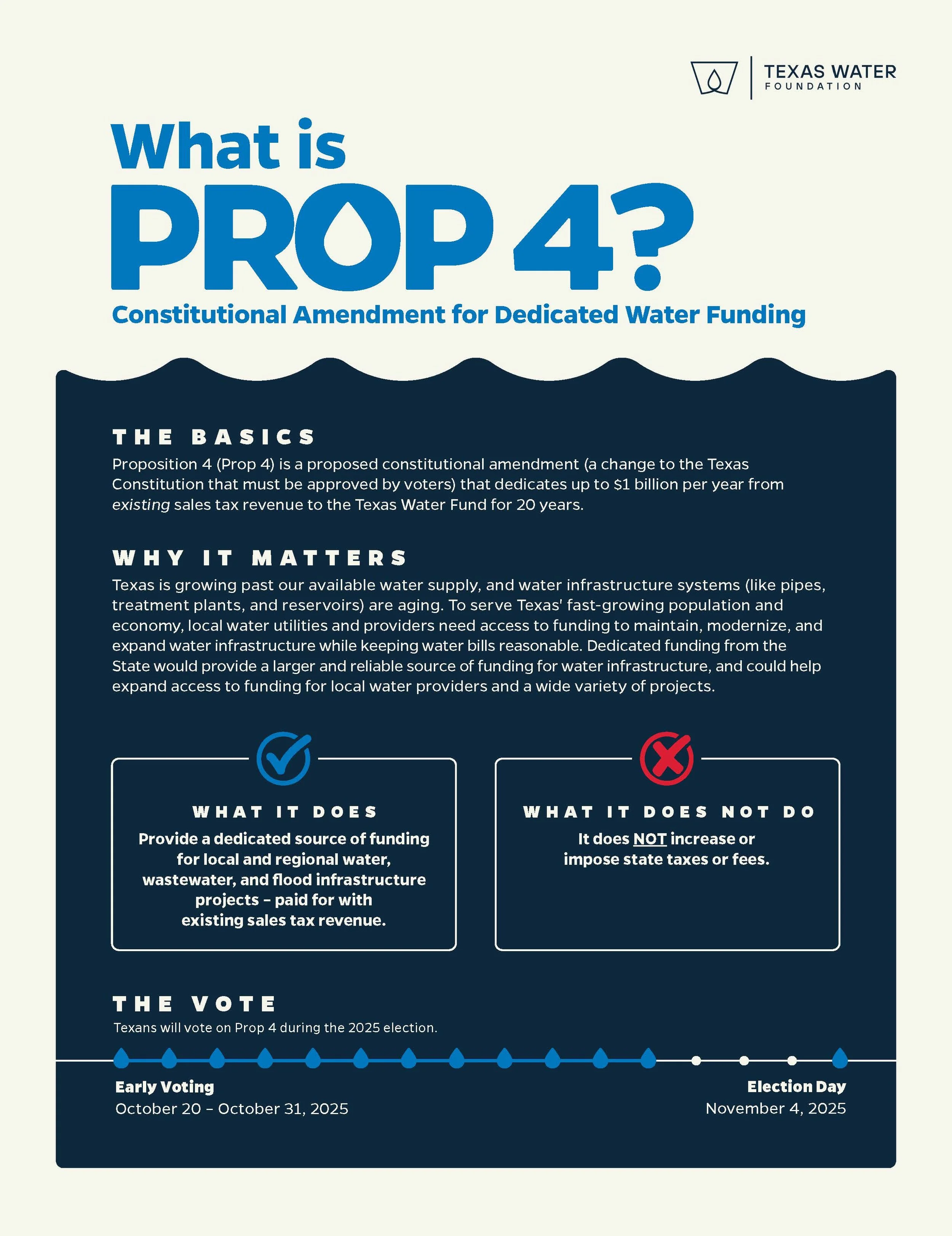 Texans on Tuesday approved a funding milestone for water infrastructure. The constitutional amendment contained in Proposition 4 has become official. This amendment dedicates up to $1 billion of sales tax revenue per year from 2027-2047 to the Texas Water Fund. This is a similar mechanism that voters approved for highways through Proposition 7 in 2015. Read the fully story here. Proposition 4 (Prop 4) is a statewide vote on a proposed constitutional amendment that would dedicate up to $1 billion per year from existing sales tax revenue to the Texas Water Fund for 20 years.